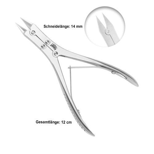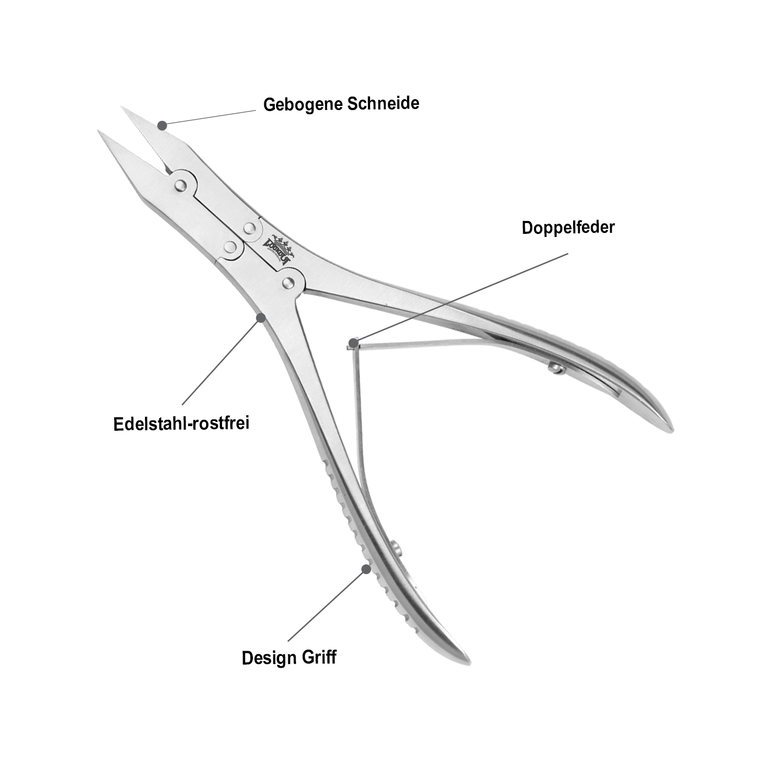 Design Handle Curved blade Double action Cantilevered cutterDouble Spring Length: 12 cm Cutting edge: 14 mmMaterial: Stainless steel